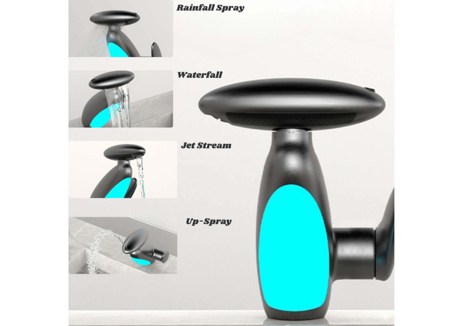 Easily switch between Waterfall, Rain, Jet and Up-Spray modes.