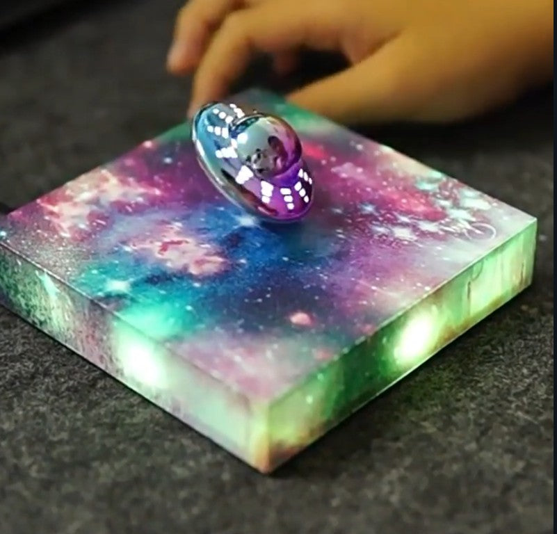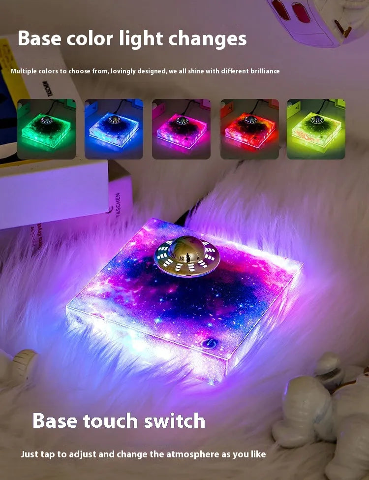 It’s easy! Just plug in the base, carefully lower the UFO over the center point until it levitates, and give it a gentle spin. A user guide is included to walk you through it.