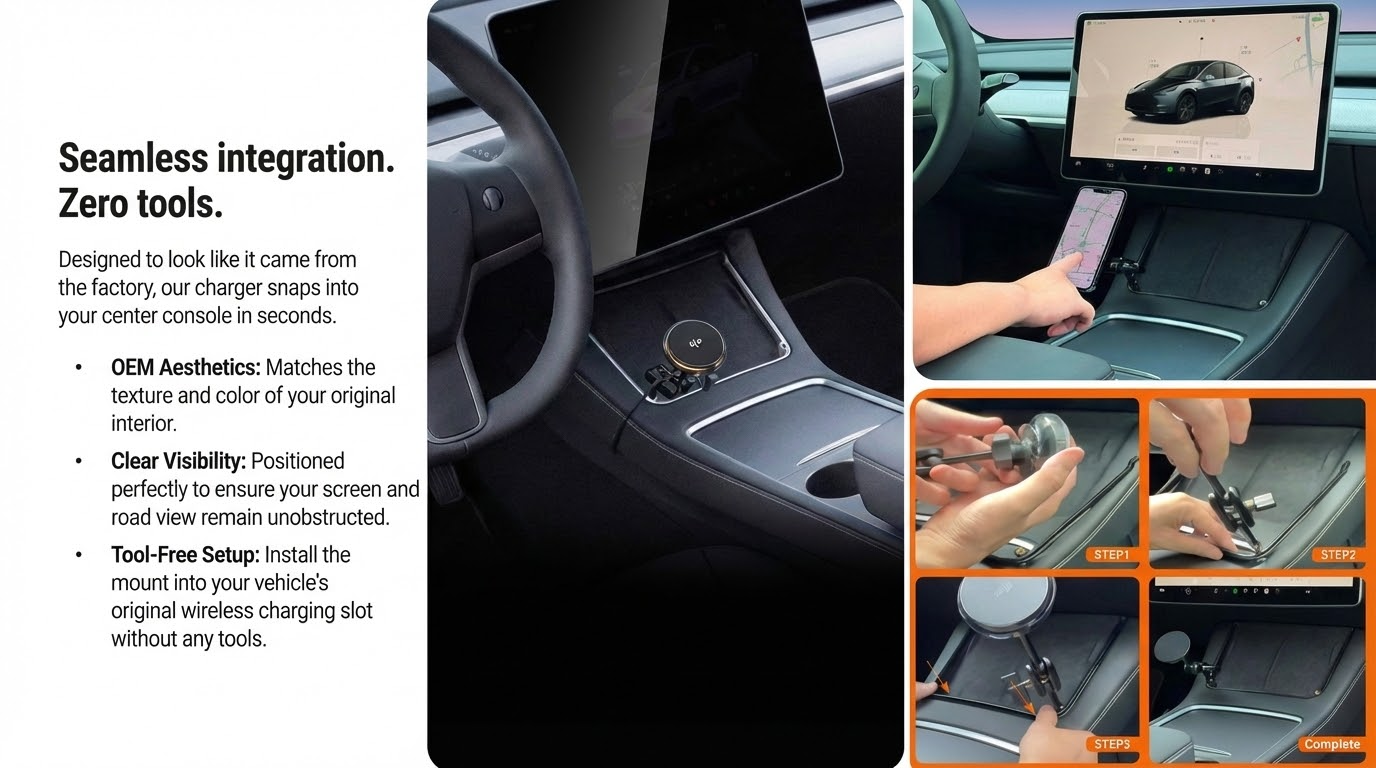 Elevate your driving experience with the ultimate wireless charging solution. Precision-engineered for Tesla Model Y (2021–2024) and Model 3 (2021–2023), this Qi2 stand blends original equipment aesthetics with next-generation power delivery.